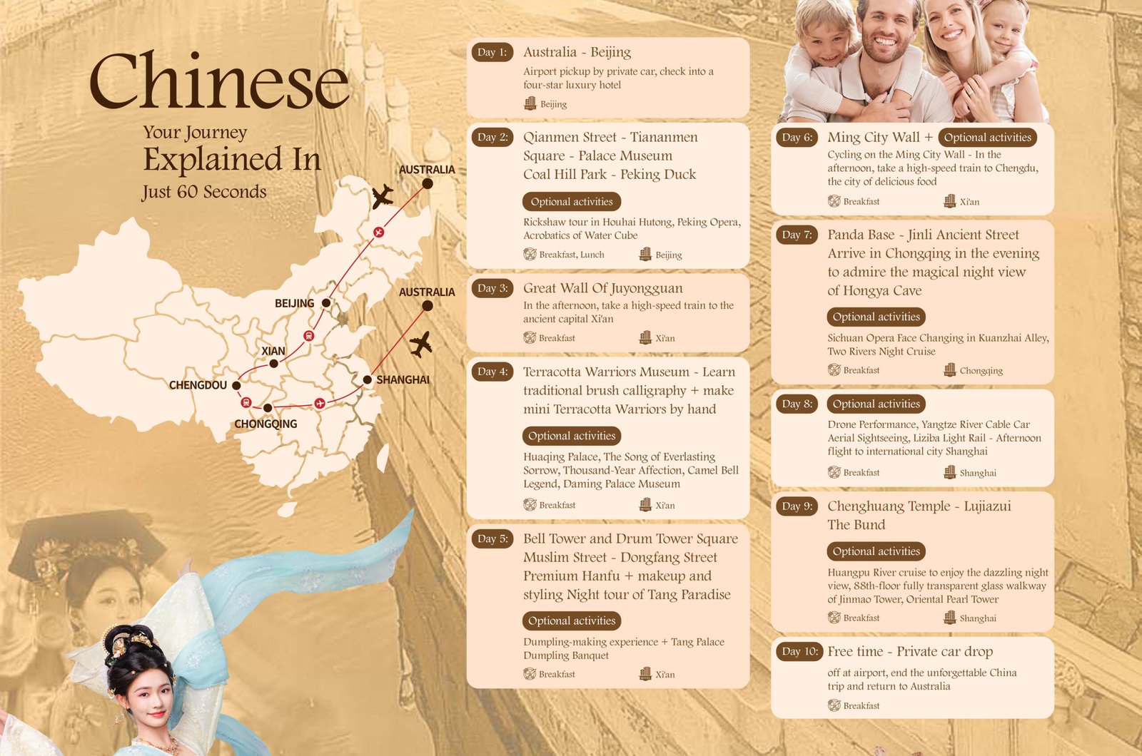 Australia – Beijing: Airport pickup by private car, check into a four-star luxury hotel. Meals: None. Accommodation: Beijing.